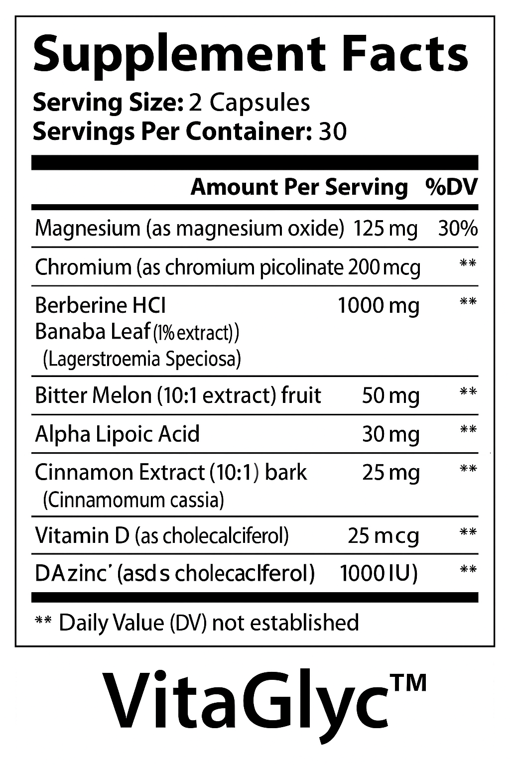 VitaGlyc™ is a natural dietary supplement designed to help support healthy blood sugar levels, especially for people with prediabetes or type 2 diabetes. It combines ingredients like Berberine, Chromium, Cinnamon Extract, and Alpha Lipoic Acid—trusted by experts for blood sugar balance and metabolic health.